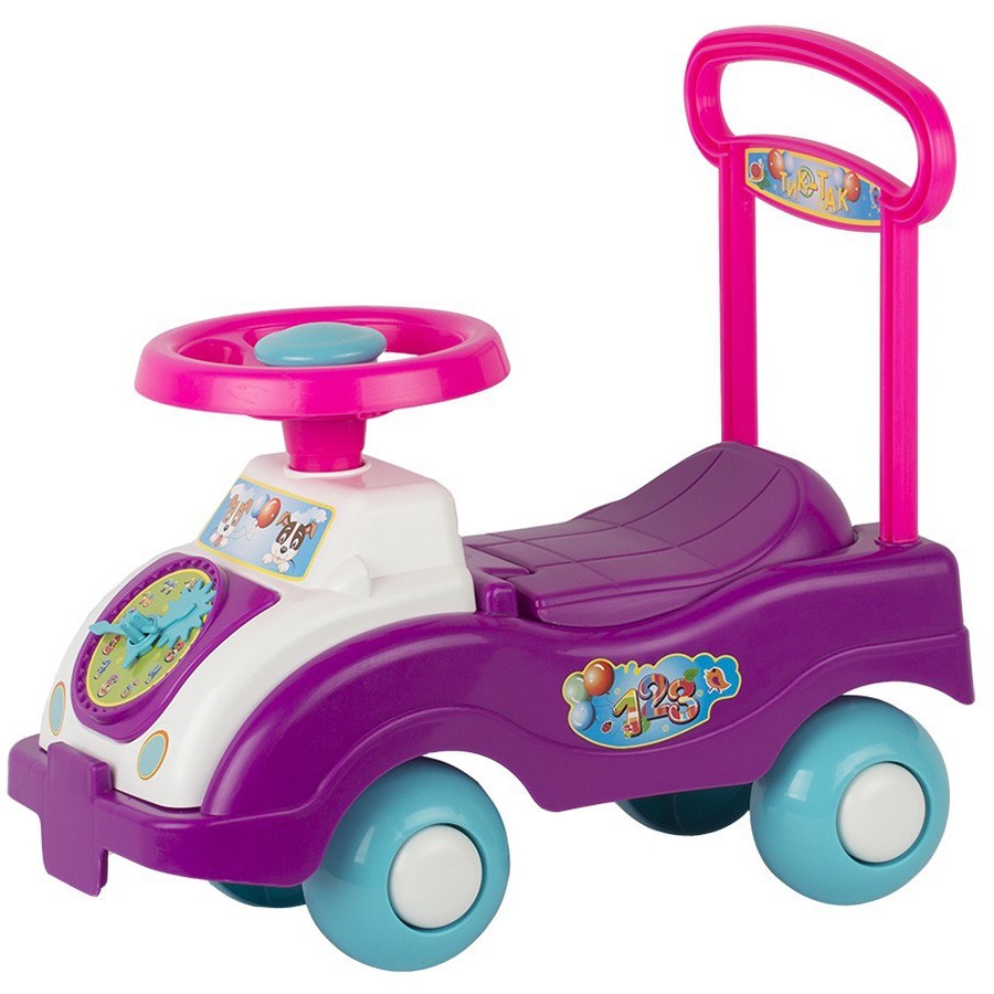 Каталка "Тик-Так" - отличное первое транспортное средство, на котором малышка сможет передвигаться самостоятельно. Сидя на удобном сиденье, девочка будет отталкиваться ножками, тем самым приводя машинку в движение. Также предусмотрена высокая спинка, которая одновременно служит ручкой-опорой для обучению уверенному хождению на ножках. Спереди у автомобиля расположен крупный циферблат, с которым ребенок может изучать время при помощи взрослых. Изделие изготовлено из качественных безопасных материалов, безопасных для детского здоровья, не имеет острых краев и зазубрин.