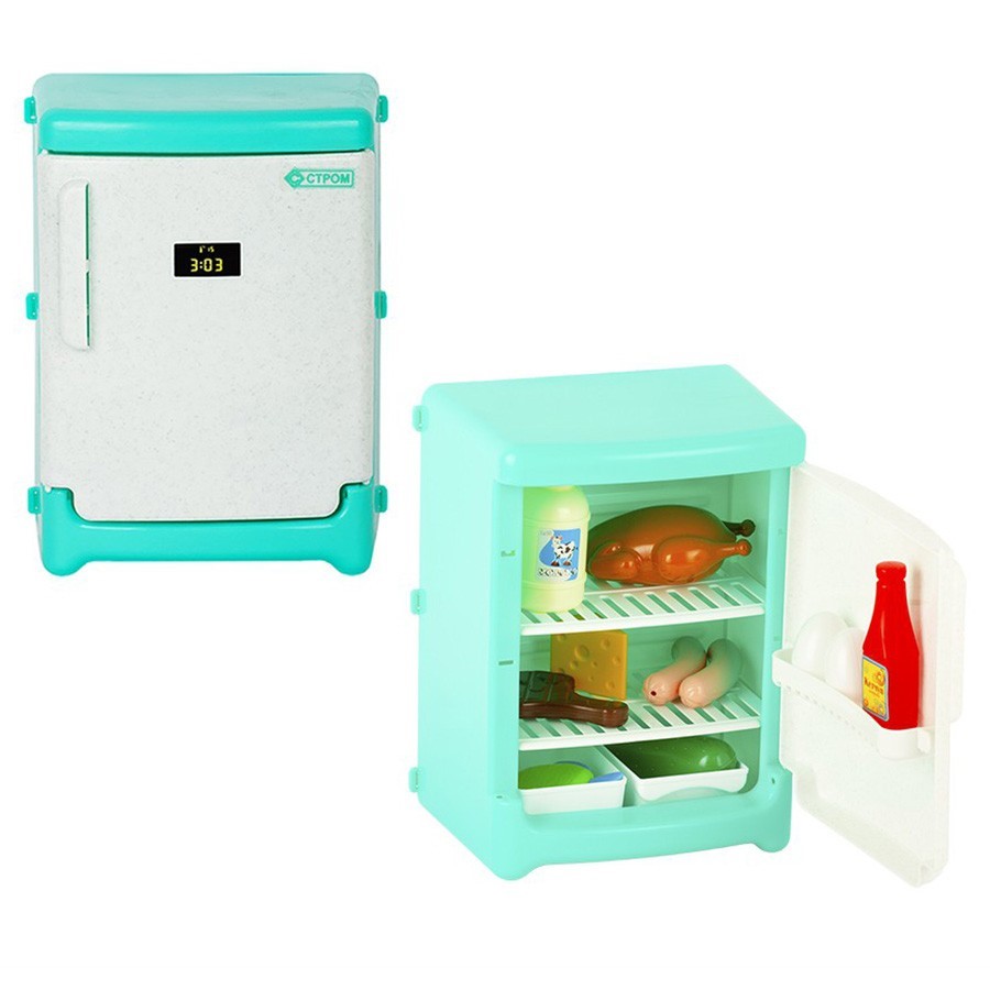 Изящный игрушечный холодильник с продуктами оснащен с двумя достаточно большими полками, на которых ребенок сможет разместить пластмассовые продукты, а внизу расположены два выдвижных ящичка. В комплект входит набор продуктов: батон, хлеб, яичница, курица, круассан, 2 сосиски и яйцо.