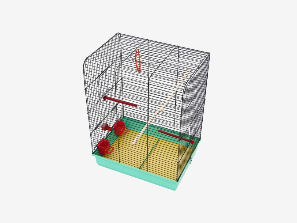 Клетка выполнена в классическом дизайне с эмалированной решеткой и плоской крышей. Конструкция включает всё необходимое для комфортного содержания птиц: две кормушки, поилку, жердочки и качели. Клетка также оснащена удобной ручкой для переноски и выдвижным поддоном для легкой уборки.