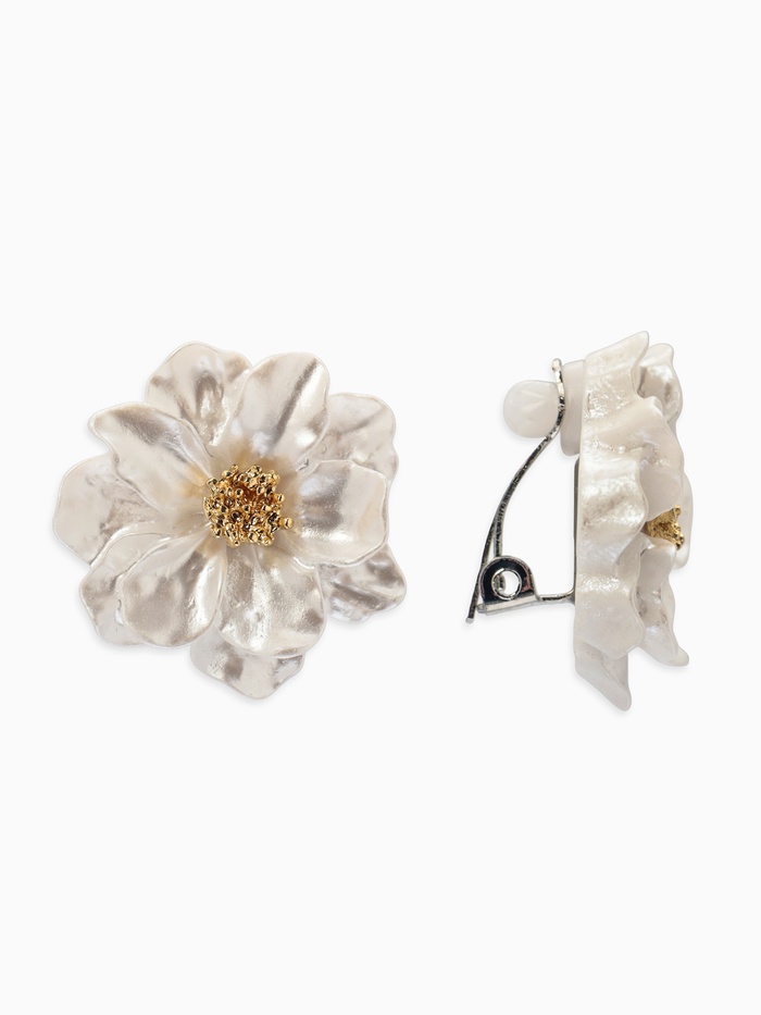 Посмотрите на обычные серёжки иначе — выберите золотые клипсы с белыми цветами и добавьте своему образу новую грань очарования и утончённости.