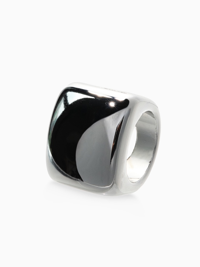 Создайте неповторимый образ, выбрав большое кольцо с геометрически четким объемом и утонченным серебристым блеском.