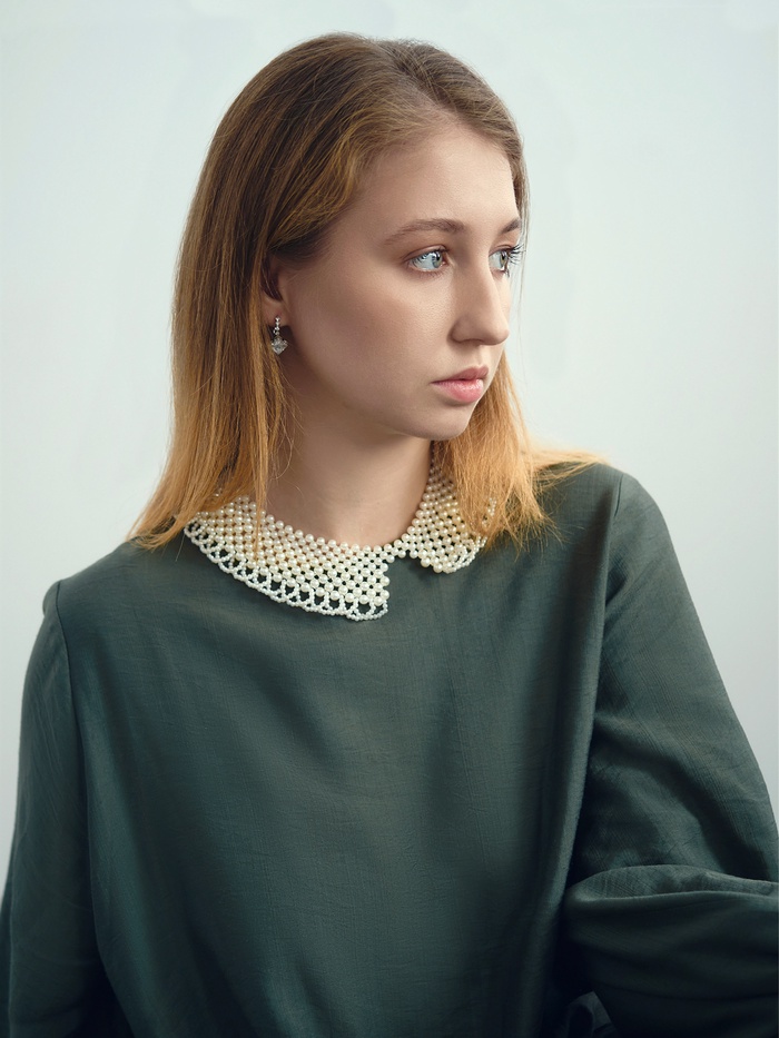 Созданное из первоклассного пластика и покрытое белым глянцем, колье представляет собой целую симфонию красивых жемчужин. Четырёхуровневая композиция охватывает шейную линию, создавая эффект плавного каскада, переходящего от крупных центральных элементов к меньшим краям.