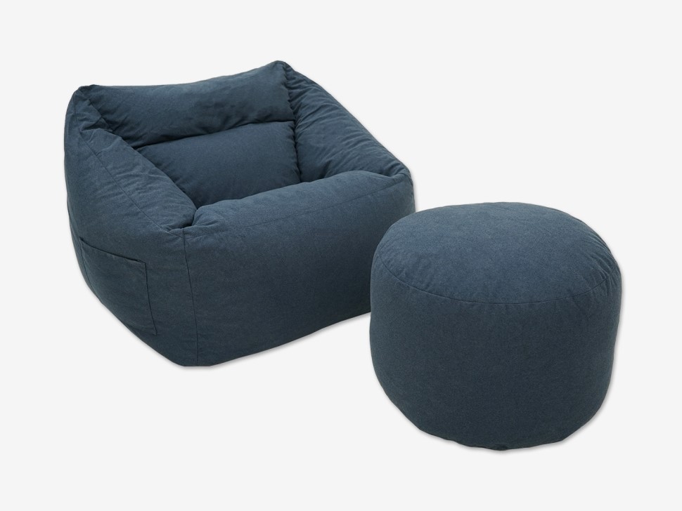 Комплект мягкой бескаркасной мебели из кресла-пуфа и пуфика, который можно использовать в качестве удобной подставки для ног или как самостоятельный предмет мебели.