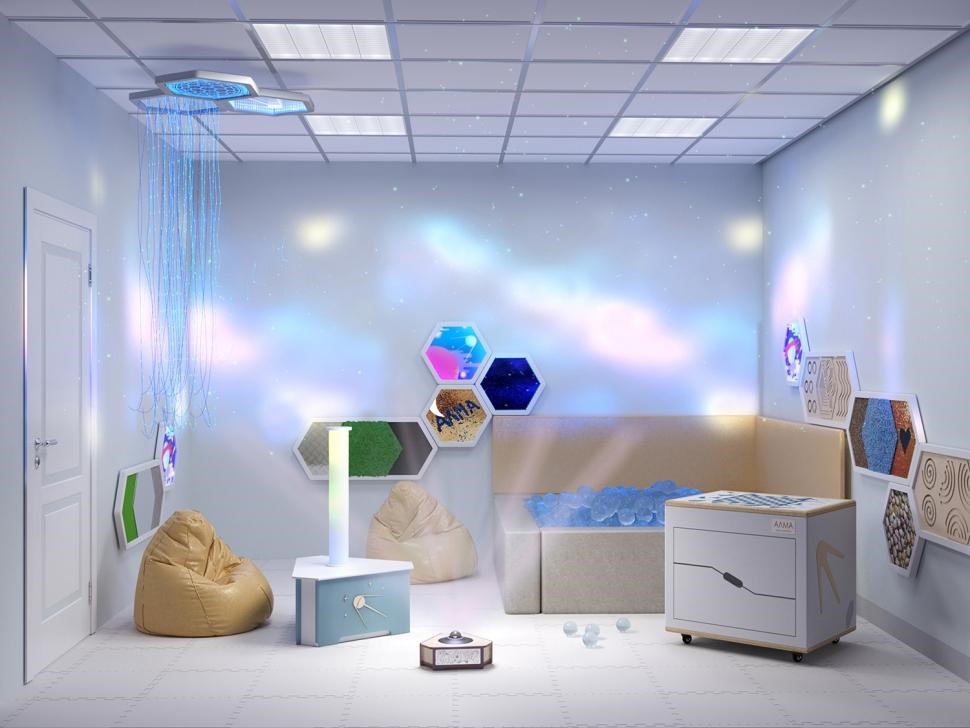 Потолочные панели служат для создания приглушённого успокаивающего освещения. Это способствует успешной психотерапевтической работе с маленькими непоседами. Фибероптические нити поблёскивают огоньками, «Зеркало бесконечности» манит в загадочные миры – всё это помогает отключиться от тревожных мыслей и сконцентрироваться на ощущениях.