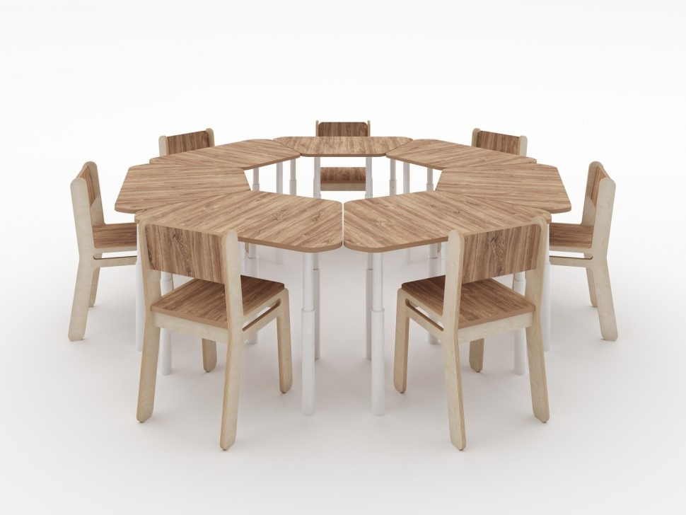 Комплекты столов в форме трапеции и растущих стульев для создания комфортной образовательной среды в ДОУ. Подходят для детей от 3 до 7 лет. Столы в форме трапеции группируются в различные композиции, максимально эргономично задействуя имеющиеся пространство класса. Растущие стулья учитывают анатомические и физиологические особенностей детей и позволяют менять высоту сидения и спинки под разный возраст.