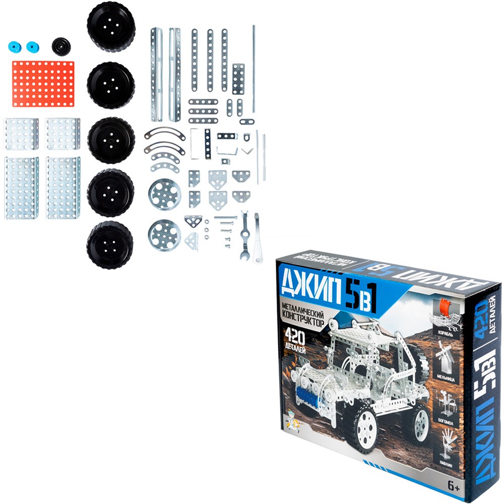 Металлический конструктор с инструментами - отличный подарок мальчикам, который позволит им самостоятельно собрать 5 моделей: джип, корабль, павлин, мельницу и богомола.