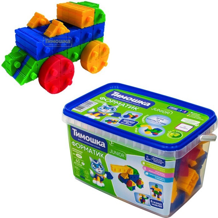 ТМ «ТИМОШКА» представляет необычный конструктор ФОРМАТИК. Из деталей конструктора можно собрать 6 разных модели, что позволяет придумать большое количество вариантов веселых сюжетно-ролевых игр.