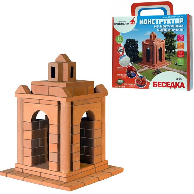 В конструктор «Беседка» входят 95 деталей (глиняные кирпичики различных форм и размеров), специальная строительная смесь «Brickmaster» из песка и крахмала и маленький мастерок. Набор также содержит миску для разведения смеси, тряпочку, подставку для постройки и подробную инструкцию. Все используемые материалы – экологически чистые и абсолютно безопасные даже для самых маленьких детей.
