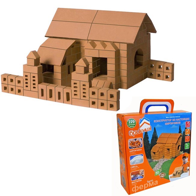Конструктор из настоящих кирпичиков «Ферма» собирается почти так же, как и реальная постройка. Для возведения этой конструкции юному строителю предстоит использовать настоящую керамику. Помимо этого, в набор входит мастерок, а также все прочие инструменты, необходимые для работы. Кроме того, в комплекте имеются компоненты для приготовления специальной строительной смеси, скрепляющей блоки. Ее юный творец также сможет приготовить самостоятельно, следуя подробной инструкции, присутствующей в наборе.