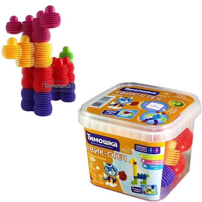 Конструктор "Квик-стеч" на 25 элементов относится к серии "Kids" и состоит из крупных деталей в форме пружинок. Элементы складываются в различные геометрические фигуры, постройки, диковинных животных и другие объекты, помогая тренировать аналитическое и пространственное мышление, логику и мелкую моторику ребенка.