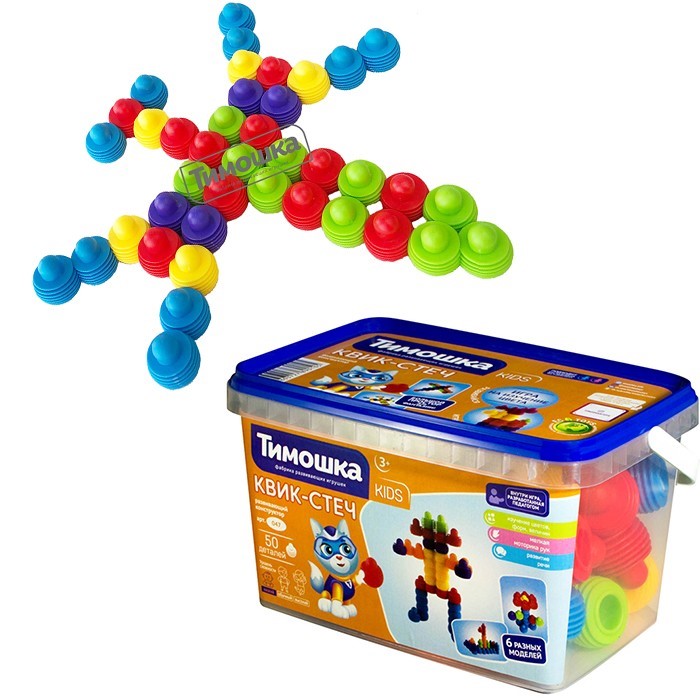 Конструктор "Квик-стеч" на 50 элементов относится к серии "Kids" и состоит из крупных деталей в форме пружинок. Элементы складываются в различные геометрические фигуры, постройки, диковинных животных и другие объекты, помогая тренировать аналитическое и пространственное мышление, логику и мелкую моторику ребенка.