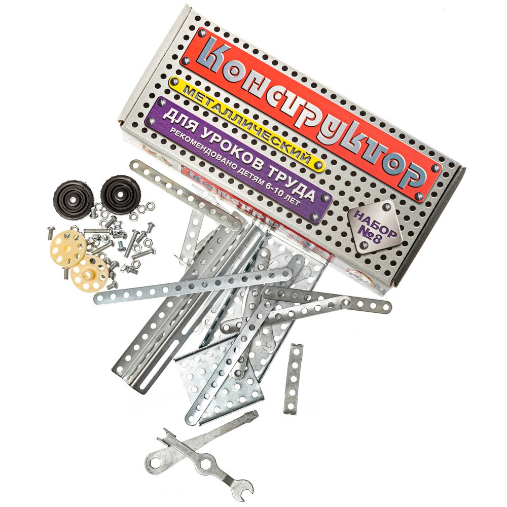 Конструктор "Для уроков труда №8" от торговой марки "Десятое королевство" представляет собой классический металлический конструктор. В комплекте есть подробная иллюстрированная инструкция с пошаговыми рекомендациями. Начинать работу над конструктором лучше всего с примеров, описанных в ней, - можно собрать сани и вертолет. Представленные модели являются только примером, так как конструктор раскрывает перед ребенком неограниченные возможности моделирования и создания своих собственных моделей. Он отлично развивает конструкторское, инженерное мышление. Металлические детали очень удобны в применении. Металлический конструктор сложнее пластикового в техническом плане, тем самым, он имеет больший развивающий потенциал. Конструирование развивает логическое и образное мышление, набл