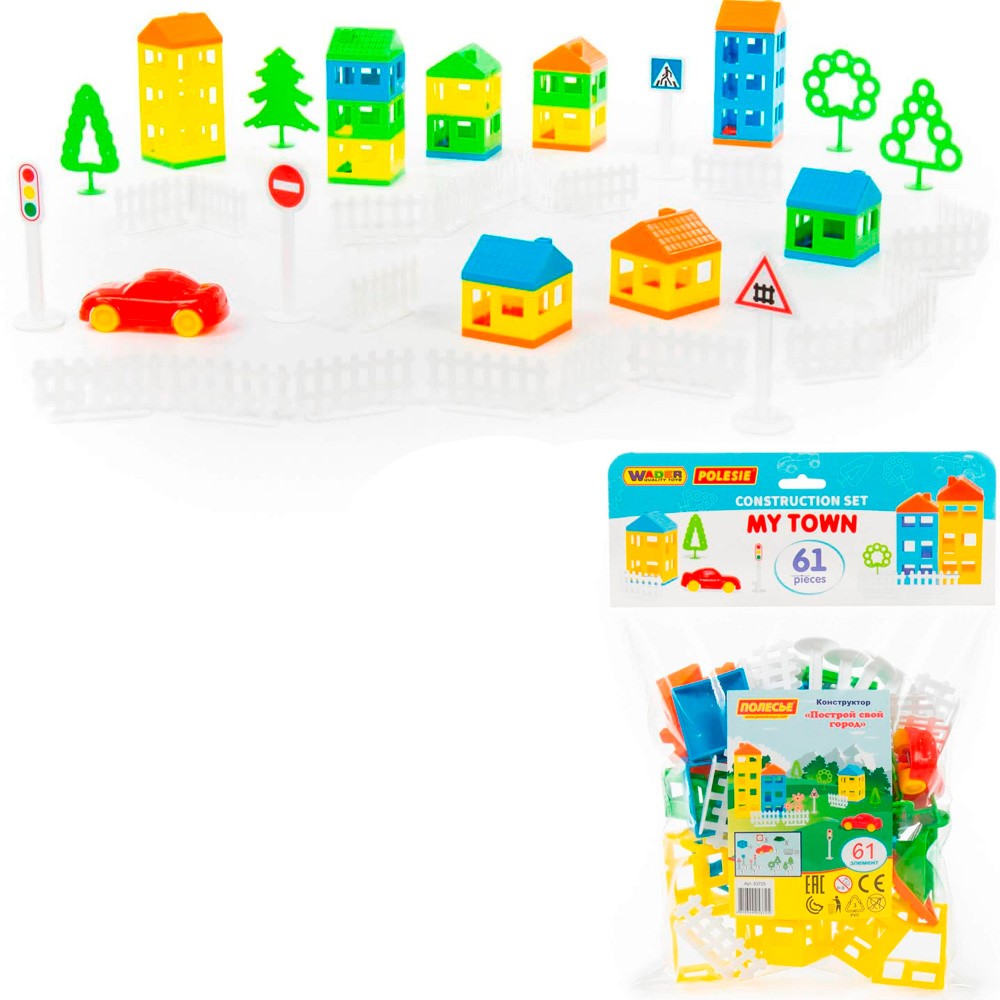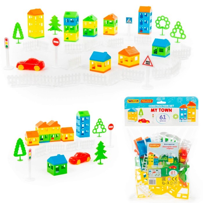 В этом конструкторе есть все, чтобы малыш смог построить свой небольшой городок. В комплект входит 61 деталь, из которых собираются домики, заборчик, машинка и знаки дорожного движения. Все элементы ярких цветов, выполнены из качественного нетоксичного пластика, без острых краев. Играя, ребенок будет развивать логические навыки, мелкую моторику и пространственное мышление.