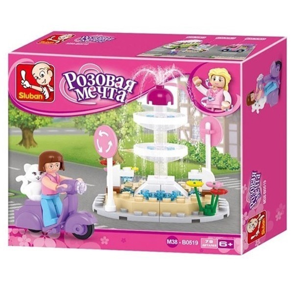 Конструктор для девочек 38-0519 из серии "Розовая мечта" от торговой марки "Sluban" - это для создания увлекательной сюжетно-ролевой игры и прекрасный подарок и возможность для ребенка весело и с пользой провести время. В процессе игры ребенок сможет создать яркий и необычный сказочный мир с принцессами и прекрасными принцами, дворцами и каретами, загородными домами и обставленными комнатами. Этот набор позволит сконструировать оригинальный фонтан на перекрестке, по которому еждет девочка на скутере в компании кошечки. Все наборы совместимы друг с другом и аналогичными наборами других производителей. Благодаря этому набору, ребенок сможет придумать множество сюжетно-ролевых игр. Конструирование развивает логическое и образное мышление, наблюдательность и самостоятельность