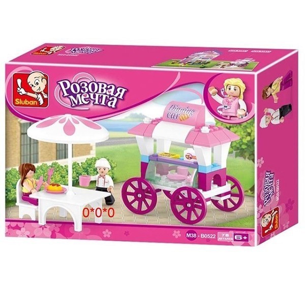 Конструктор для девочек 38-0522 из серии "Розовая мечта" от торговой марки "Sluban" - это для создания увлекательной сюжетно-ролевой игры и прекрасный подарок и возможность для ребенка весело и с пользой провести время. В процессе игры ребенок сможет создать яркий и необычный сказочный мир с принцессами и прекрасными принцами, дворцами и каретами, загородными домами и обставленными комнатами. Этот набор позволит сконструировать оригинальное передвижное кафе. В комплект входят подвижные фигурки официанта и посетительницы, а также стол со стульчиком, зонтик и посуда. Все наборы совместимы друг с другом и аналогичными наборами других производителей. Благодаря этому набору, ребенок сможет придумать множество сюжетно-ролевых игр. Конструирование развивает логическое и образное мы