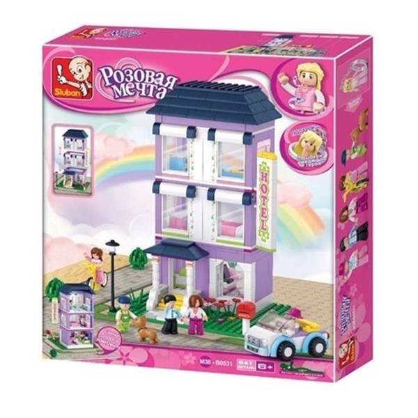 Конструктор для девочек 38-0531 из серии "Розовая мечта" от торговой марки "Sluban" - это для создания увлекательной сюжетно-ролевой игры и прекрасный подарок и возможность для ребенка весело и с пользой провести время. В процессе игры ребенок сможет создать яркий и необычный сказочный мир с принцессами и прекрасными принцами, дворцами и каретами, загородными домами и обставленными комнатами. Этот набор позволит сконструировать оригинальный трехэтажный отель и автомобиль. В комплект входят подвижные фигурки человечков и аксессуары. Все наборы совместимы друг с другом и аналогичными наборами других производителей. Благодаря этому набору, ребенок сможет придумать множество сюжетно-ролевых игр. Конструирование развивает логическое и образное мышление, наблюдательность и самосто