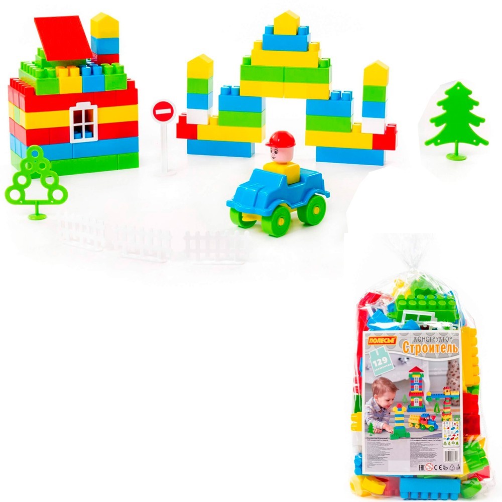 Конструктор "Строитель" состоит из 129 элементов различных форм и цветов. В набор входят детали для создания домов, замков, а также деревья, которые помогут придать завершенный вид сказочному городку. Все элементы плотно соединяются друг с другом, а также легко расцепляются, имеют гладкие поверхности без зазубрин, и изготовлены из качественных безопасных материалов. Игра с таким конструктором поможет ребенку в развитии мелкой моторики, пространственного мышления, воображения и цветового восприятия. Цвета представлены в ассортименте.