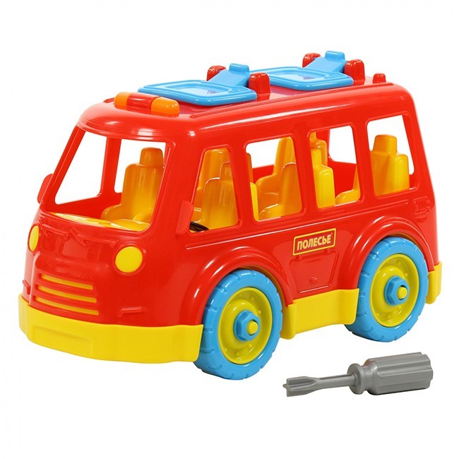 Этот яркий оригинальный конструктор для самых маленьких представляет собой сборную модель автобуса. Ее необходимо собирать из деталей при помощи шурупов и гаек, а помогут в этом инструменты, входящие в комплект. В процессе этой увлекательной игры малыш научится отвинчивать и завинчивать гайки, будет тренировать внимание, мелкую моторику и мышление. Игрушка красочно оформлена и изготовлена из качественного пластика с применением безопасных красителей.