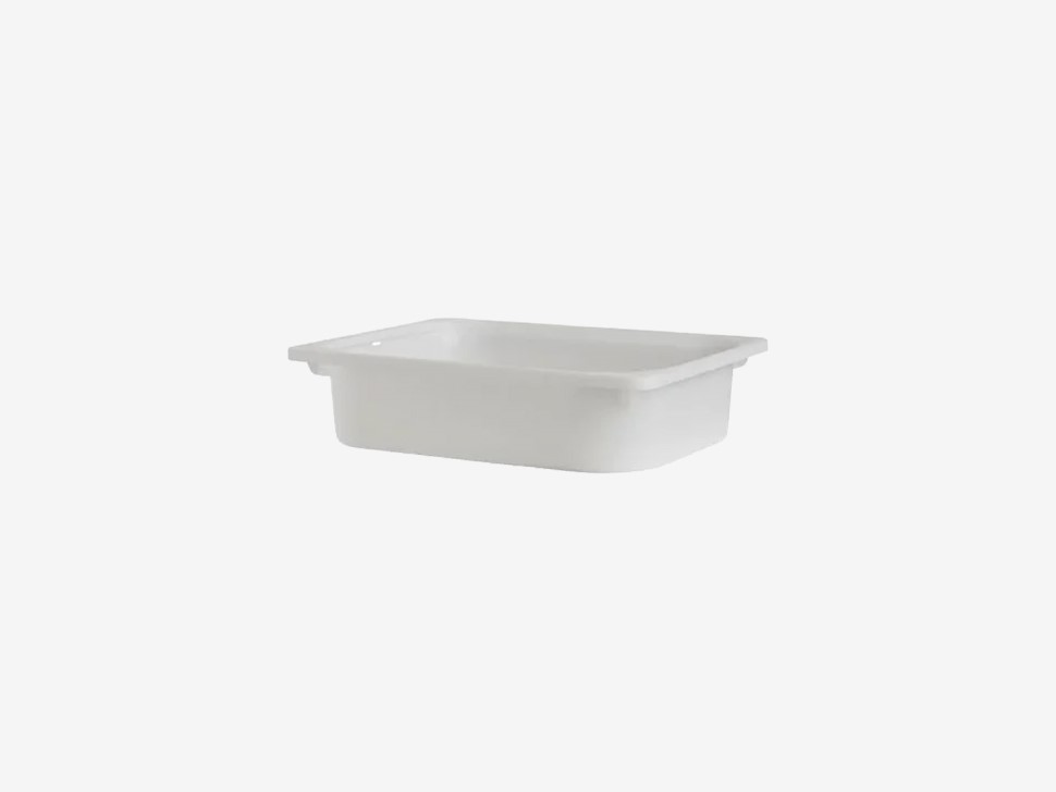Неглубокий белый контейнер для хранения мелков, кубиков и пазлов. Изготовлен из прочного пластика.