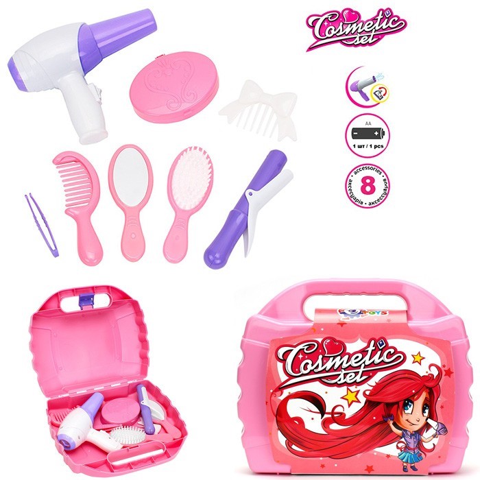 Комплектация: фен, плойка, расческа, щетка, зеркальце, заколка расческа, пудреница, пинцет