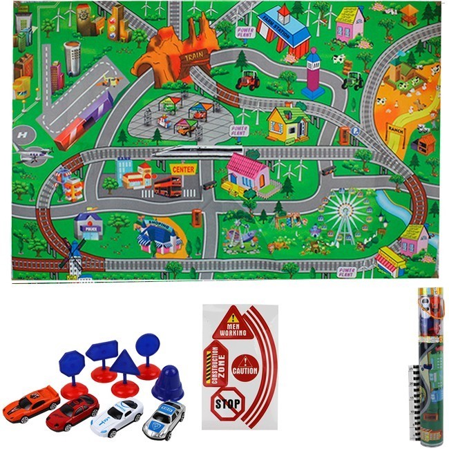Большой и красочный игровой коврик окажется для малыша огромной ареной для игр. Внимательно изучив каждый уголок коврика, ребенок сможет попробовать включить воображение и расставить знаки и машинки в той комбинации, какая показалась ему максимально подходящей. Передвигать машинки можно по поверхности коврика, где изображены дороги. Также, направляя машинки по их маршруту, можно соблюдать правила дорожного движения, о которых оповещают знаки, а можно быть злостным нарушителем и устроить столкновение машинок прямо на пересечении путей, должным образом обыграв дорожное происшествие.