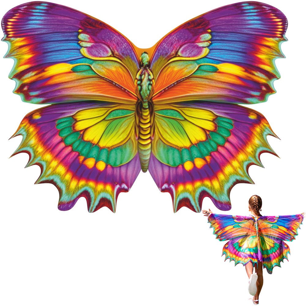 Костюм имеет яркий дизайн с принтом с изображением крылышек бабочки. Ткань очень легкая и приятная на ощупь. При движении крылышки как будто трепыхаются, а ребенок начинает порхать.