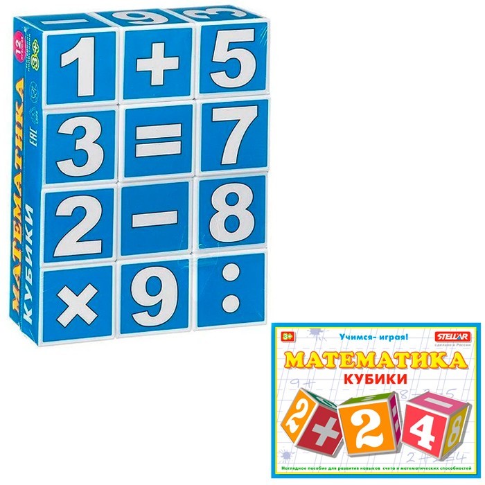 Игровой набор "Математика" 00706 торговой марки Stellar - это кубики с цифрами. В комплект входят 12 кубиков с изображением цифр и арифметических действий. С помощью набора можно закрепить и расширить знания детей. Такое занятие положительно сказывается на всестороннем развитии ребенка: тренируется память, сообразительность, пространственное и образное мышление, координация и моторика рук. Кубики – простая, но многофункциональная игрушка. Кроме того, кубики можно использовать для строительства обычных башенок и домиков.