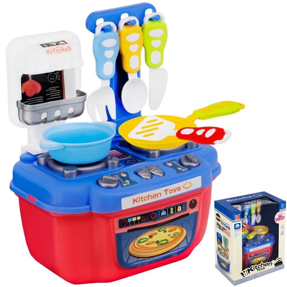 Комплектация: основание - 1 шт., варочная панель - 1 шт., стойка с крючками - 1 шт., полка - 1 шт., ложка - 1 шт., нож - 1 шт., лопатка - 1 шт., вилка - 1 шт., сковорода - 1 шт., кастрюля - 1 шт., крышка - 1 шт., доска - 1 шт., тарелка - 1 шт., продукты - 7 шт., решетка - 1 шт.
