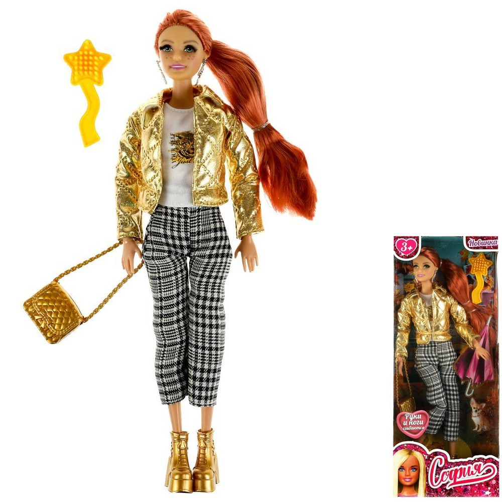 Комплектация: кукла - 1 шт., бижутерия, костюм - 1 шт., ботинки - 1 пара, сумочка - 1 шт., расческа - 1 шт., зонт - 1 шт., питомец - 1 шт.