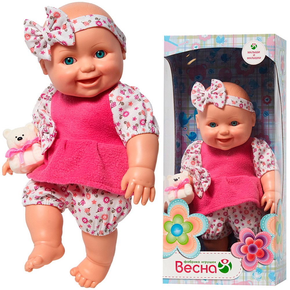 Высота игрушки: 300мм Малышка с мишуткой - милый и обаятельный карапуз. Игры с таким пупсом помогут сформировать у вашего ребёнка чувство ответственности, навыки заботы о младших. Малышку так и хочется взять на ручки и позаботиться о ней.