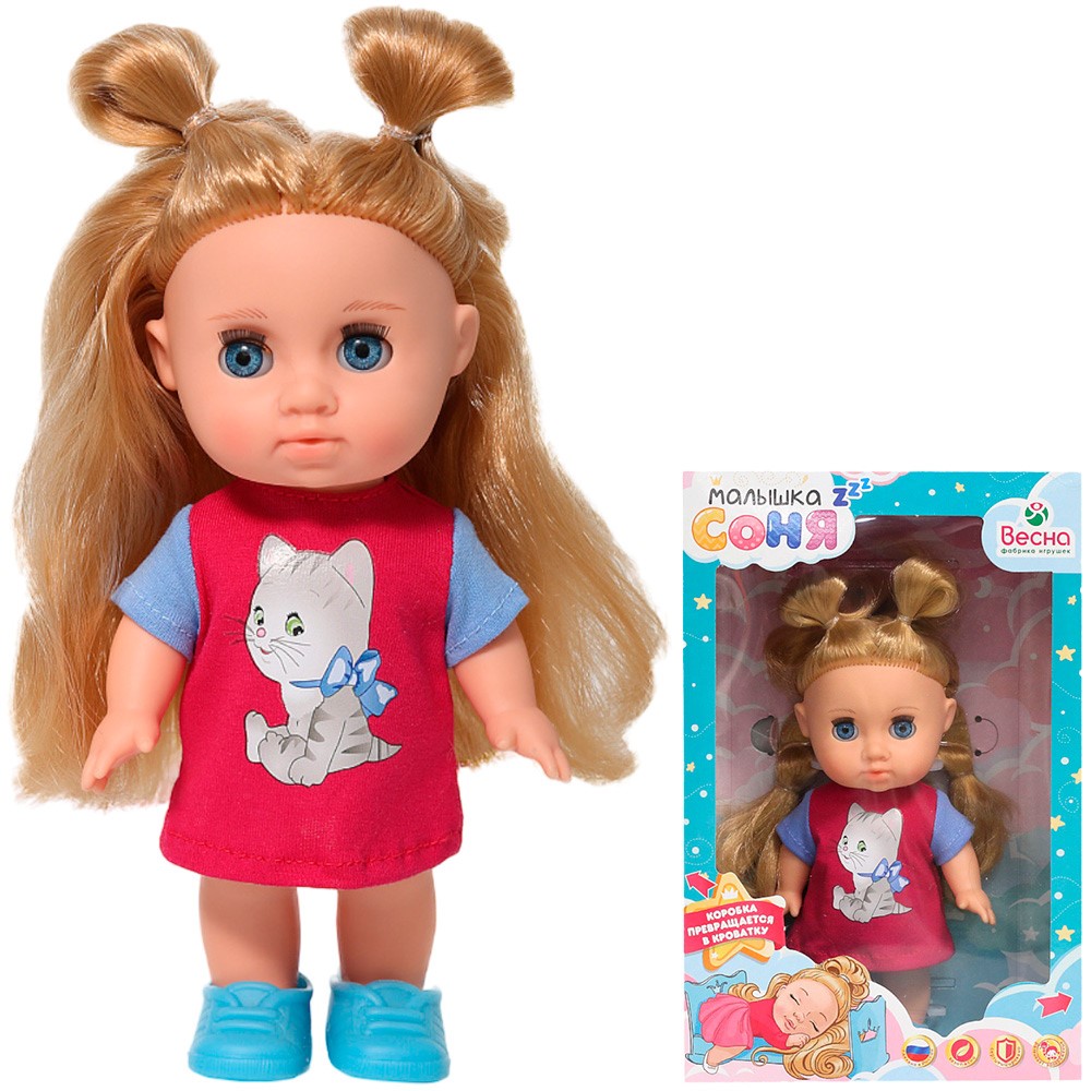 Малышка Соня Котенок непременно понравится девочке и станет одной из ее любимых игрушек. Рост Сони всего 22 см, благодаря чему ее можно всюду брать с собой - в детский сад, в гости и на прогулку. Одета малышка в платье из яркого трикотажа, украшенное наклейкой с котенком, на ногах - туфли-балетки. У Сони густые прошитые волосы из качественного нейлона, вставные закрывающиеся глаза, подвижные ручки и ножки, благодаря которым ее можно садить, укладывать спать и переодевать. Кукла полностью выполнена из качественного винила, приятного на ощупь, звуковые устройства отсутствуют.