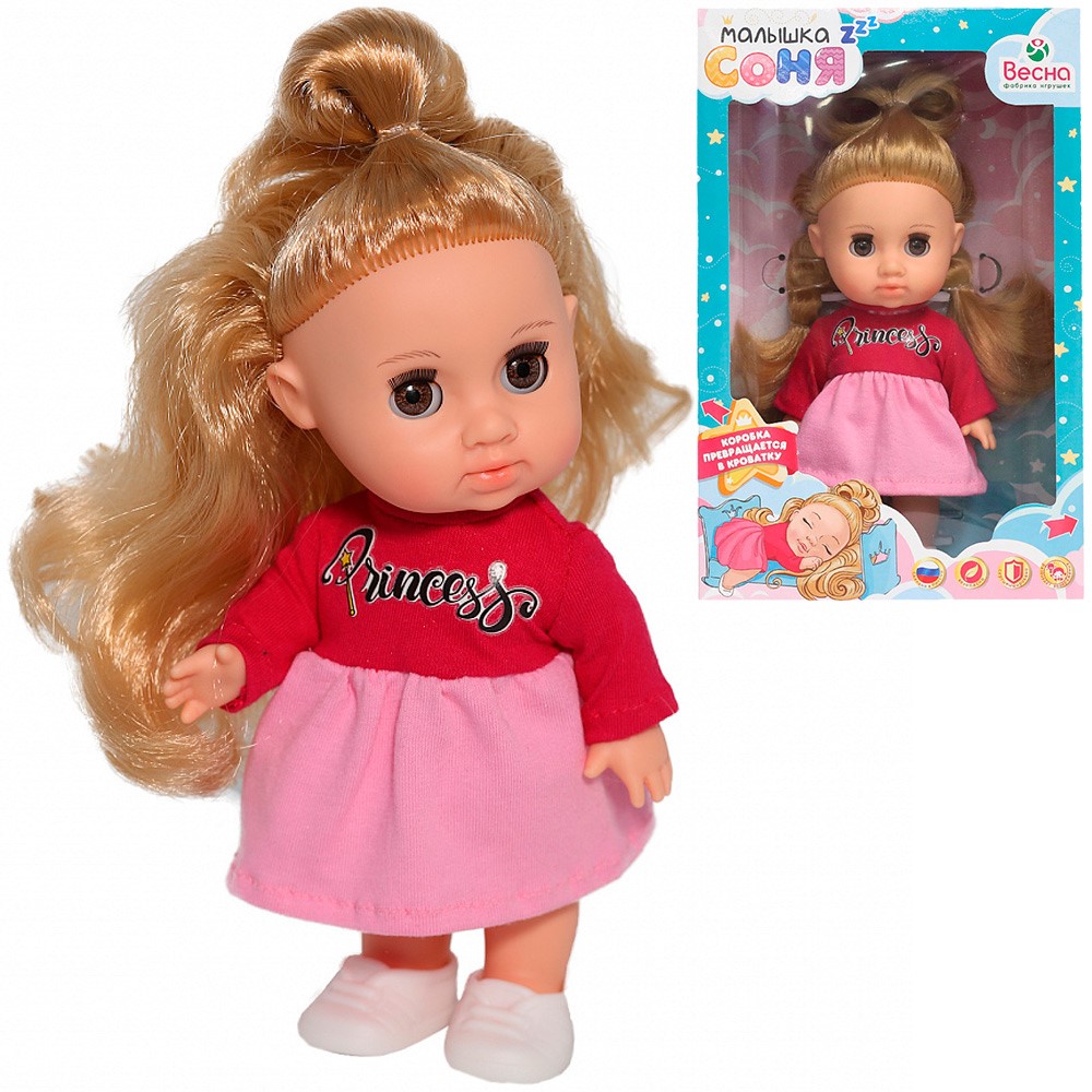 Малышка Соня Принцесса непременно понравится девочке и станет одной из ее любимых игрушек. Рост Сони всего 22 см, благодаря чему ее можно всюду брать с собой - в детский сад, в гости и на прогулку. Одета малышка в платье из яркого трикотажа, украшенное наклейкой с надписью, на ногах - туфли-балетки. У Сони густые прошитые волосы из качественного нейлона, вставные закрывающиеся глаза, подвижные ручки и ножки, благодаря которым ее можно садить, укладывать спать и переодевать. Кукла полностью выполнена из качественного винила, приятного на ощупь, звуковые устройства отсутствуют.