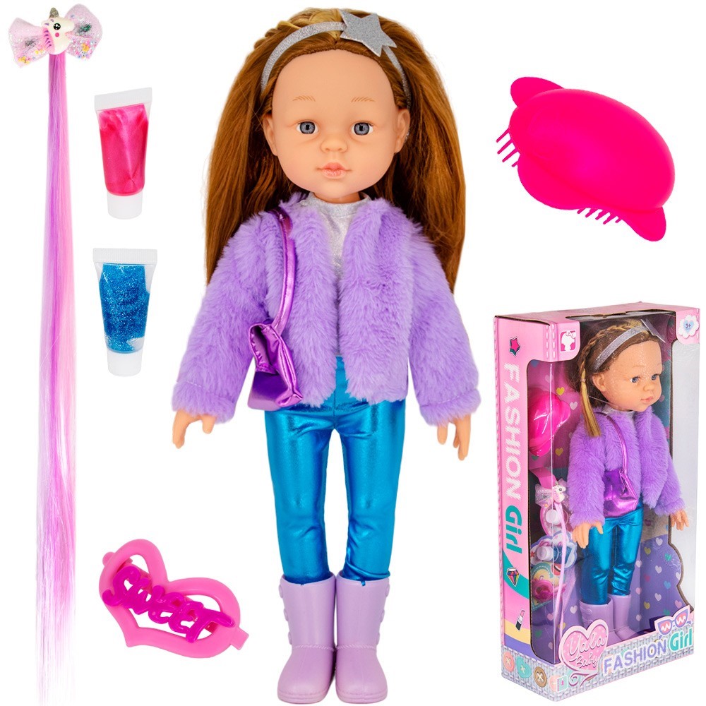 - в комплекте с куклой: 2 блестящих глитера для волоса, расческа, заколка и прядь ярких волос на застежке