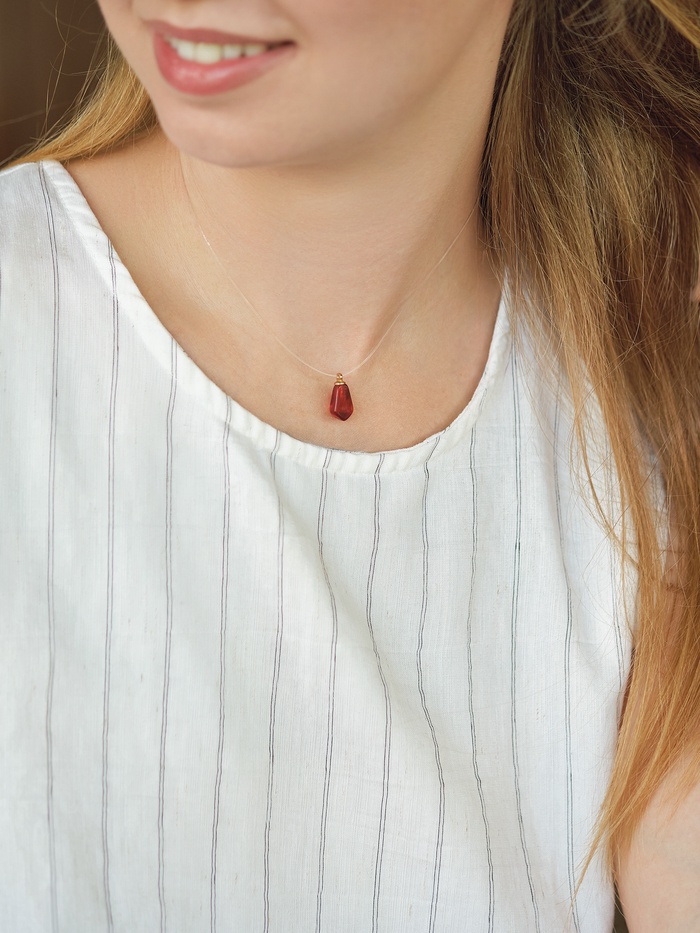 Глубокий бордовый оттенок кулона на леске создаёт выразительный акцент, который легко впишется в любой образ, добавляя ему загадочности и утончённости. Длина 33 см с дополнительными 5 см позволяет регулировать посадку, обеспечивая комфорт и универсальность ношения.