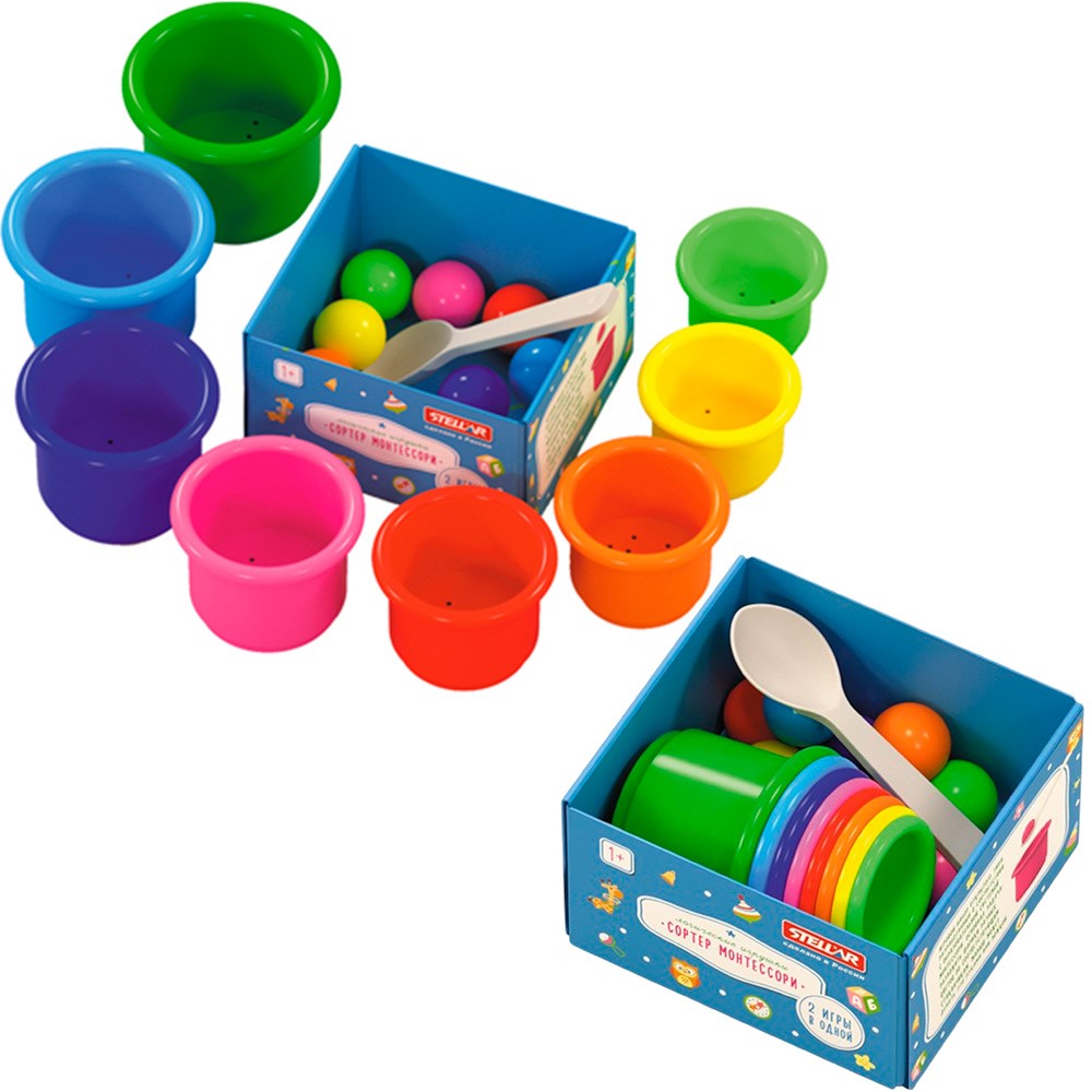 Задача малыша — разложить шарики по стаканчикам соответствующих цветов при помощи ложки или руками.