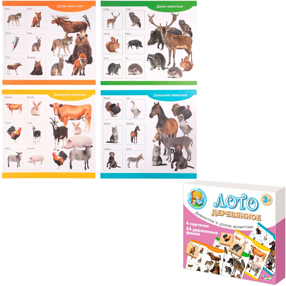 Комплект: 4 картонные карточки с тематическим картинками домашних и диких животных, 24 фишки.