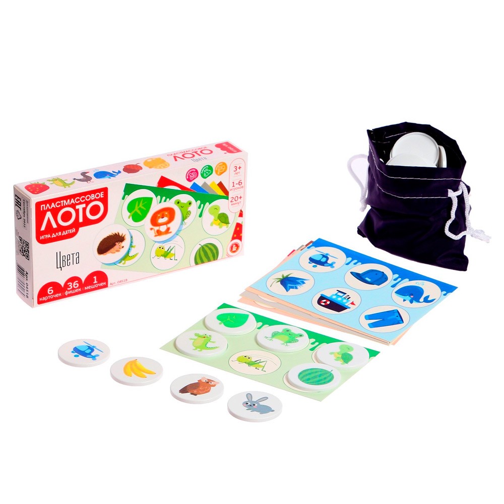 Комплектация: карточка (14,5 х 9 см) – 6 шт., фишка (4 см) – 36 шт., мешочек – 1 шт.
