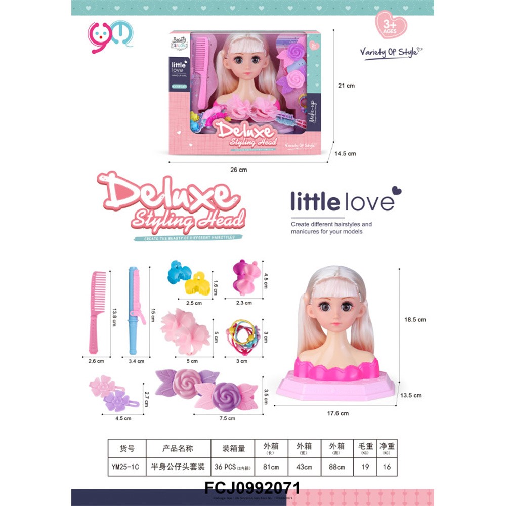 Комплектация: манекен - 1 шт, расческа - 1 шт, плойка - 1 шт, заколки - 6 шт, крабики - 2 шт, резинки - 7 шт