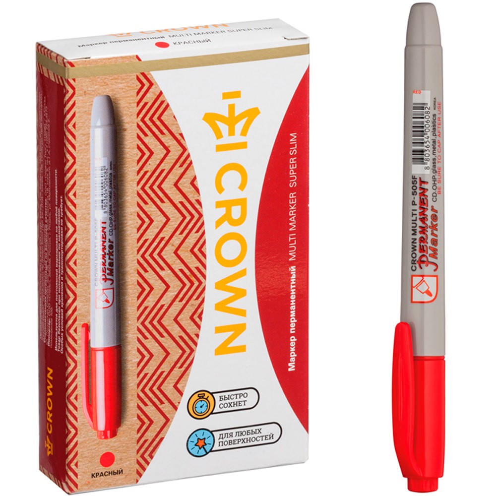 Маркер красный перманентный Crown "Multi Marker Super Slim" пулевидный, 1мм P-505F