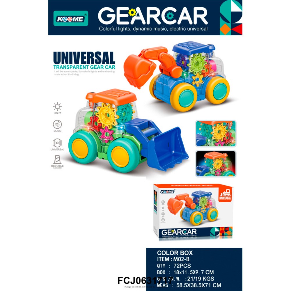 Функционал: инерционный механизм, прозрачный корпус, внутри цветные шестеренки, подвижные элементы, свет, звук