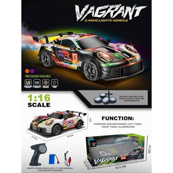 Комплектация: машинка, пульт управления, аккумулятор, кабель для зарядки, колеса - 4 шт, балонный ключ, бутылочка