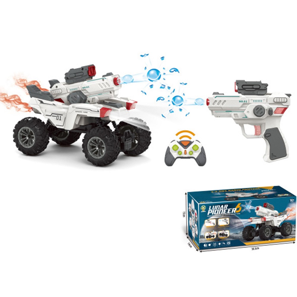 Комплектация: машина - 1 шт, пульт управления - 1 шт, аккумулятор - 1 шт, USB-кабель - 1 шт, пистолет - 1 шт, отвертка - 1 шт, бутылочка для воды - 1 шт, пули - 2 уп, воронка - 1 шт, емкость для пуль - 1 шт