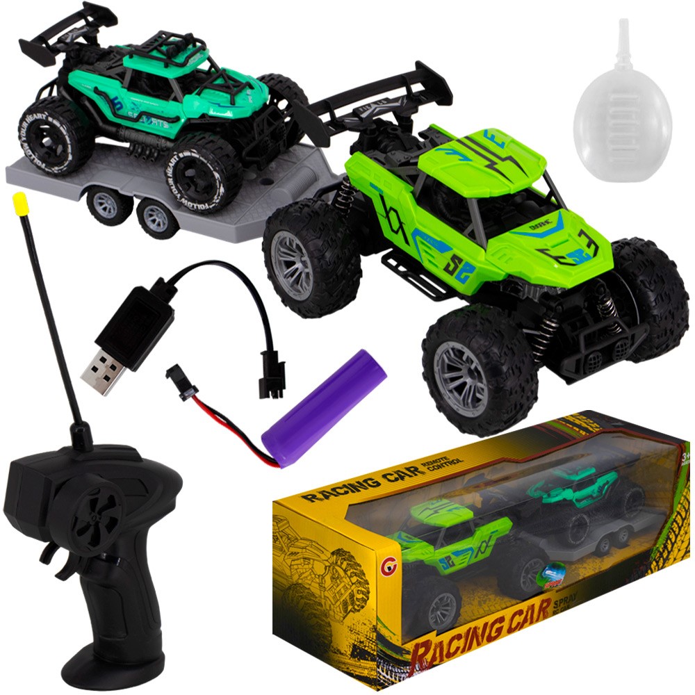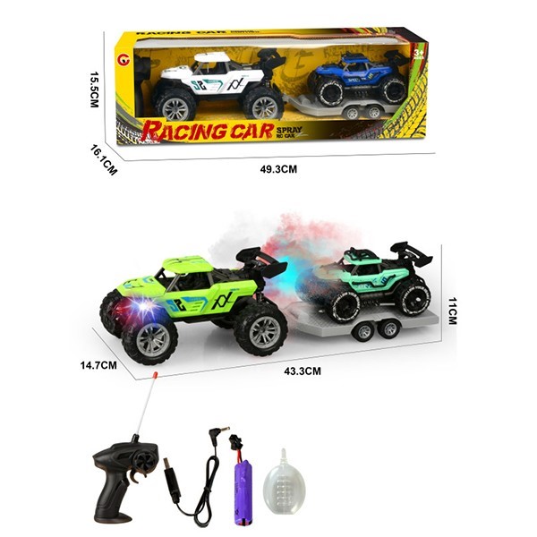 Комплектация: машинка- 2 шт, прицеп - 1 шт, пульт - 1 шт, аккумулятор - 1 шт, кабель для зарядки - 1 шт, бутылочка - 1 шт