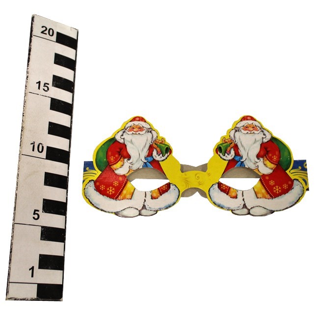 Оригинальные картонные очки могут стать дополнением к костюму на праздник, подарком - как открытка - или шуточным атрибутом для проведения конкурсов или постановок, например, на корпоративе или школьном мероприятии. Яркая маска, декорированная фигурами Деда Мороза привлечет внимание. Изделие выполнено из плотного картона.