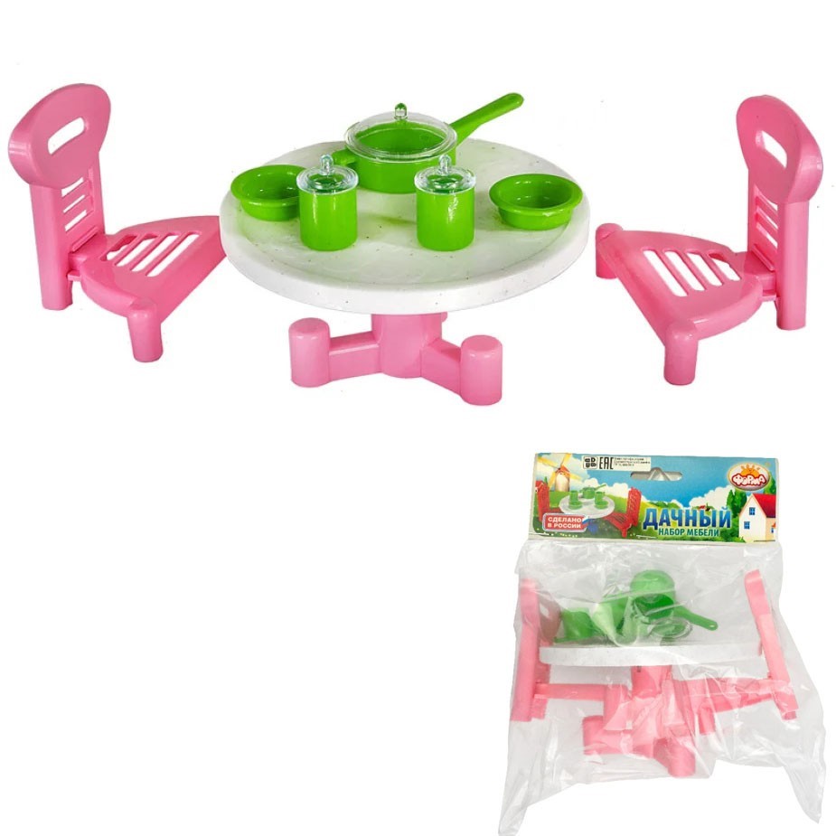 Любой девочке хочется, чтобы у ее кукол было как можно больше аксессуаров для интересных и увлекательных игр. Яркая мебель с комплектом посуды станет прекрасным подарком для Вашей малышки! В «Дачный» комплект входит: стол круглый, 2 стула, 5 предметов посуды. Набор подходит для кукол ростом до 15 см.