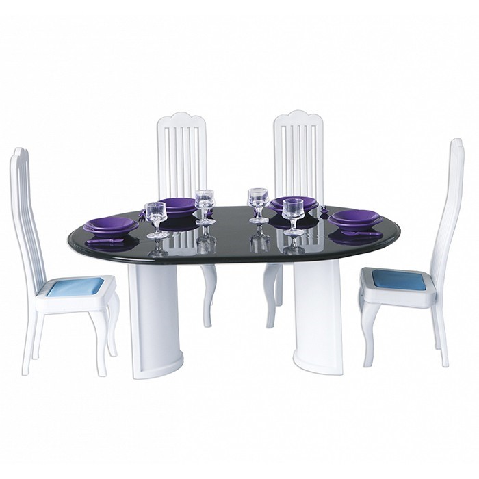 Элегантная столовая "Конфетти" представлена в классическом цвете. Богатое сочетание белого и бирюзового цвета и яркая фиолетовая посуда хорошо впишутся в интерьер коттеджа "Конфетти". В набор входит стол, четыре стула и набор посуды на 4 персоны. В комплект игрушки входят: