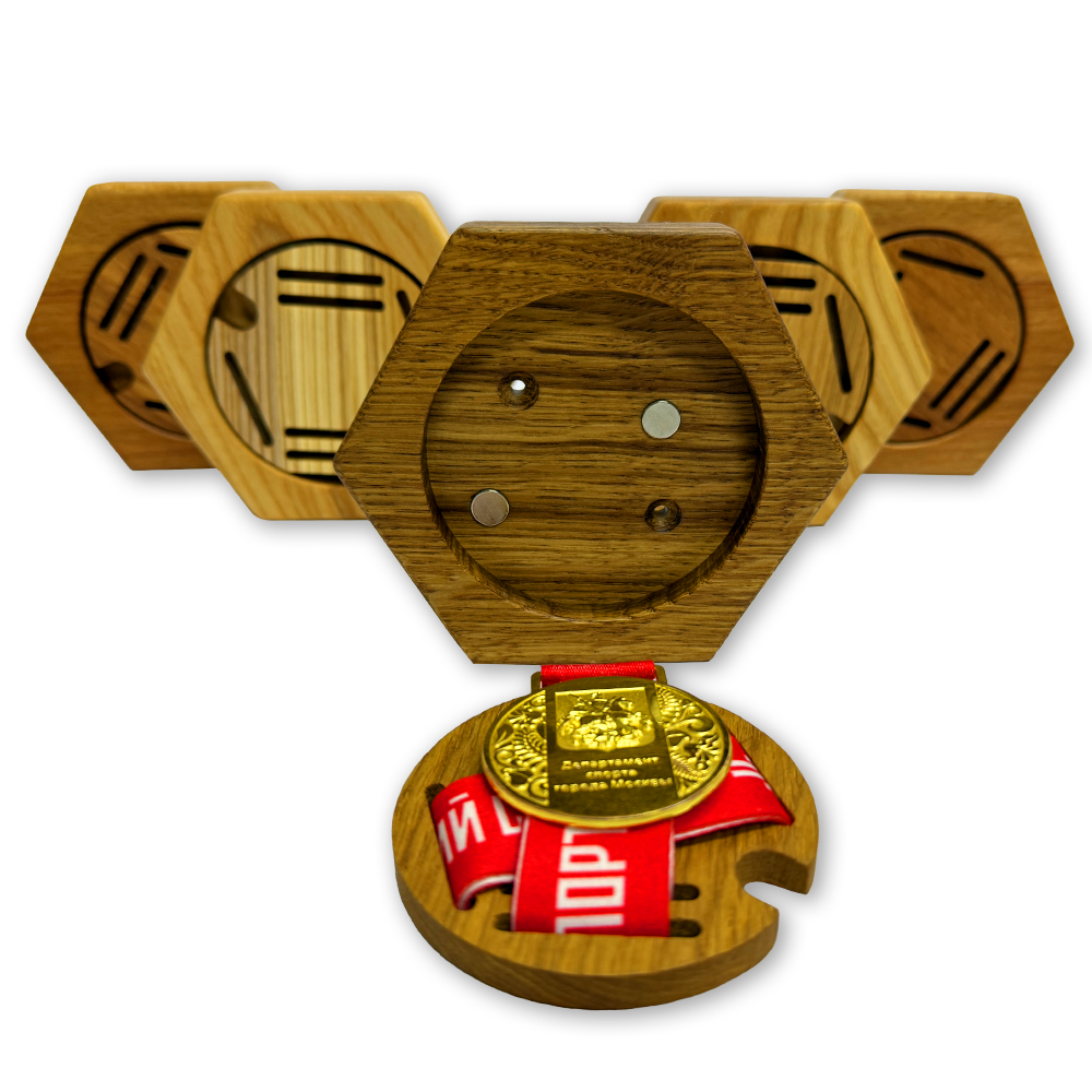 Деревянная настенная медальница в форме шестиугольника предназначена для эстетичного и надёжного хранения и демонстрации медалей. Каждый модуль изготавливается из твёрдой древесины дуба, ясеня, бука или граба, что гарантирует долговечность и устойчивость конструкции. Готовое изделие покрывается специальным безопасным маслом, подчёркивающим натуральную текстуру дерева и обеспечивающим защиту.