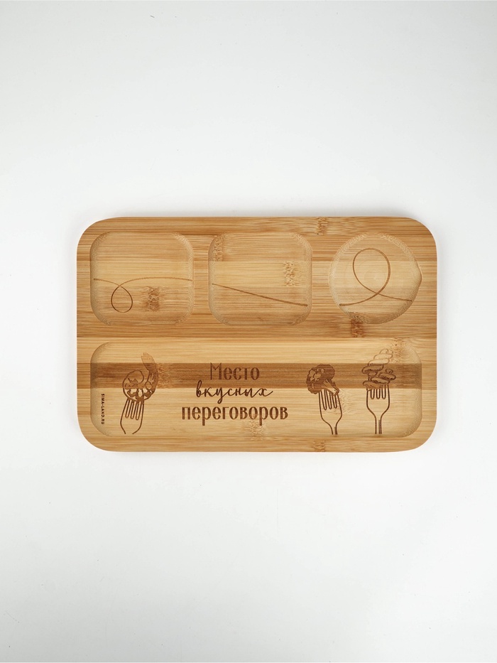Менажница «Вилочки» — это приглашение к столу, вырезанное в бамбуке. Её бежевая поверхность, как лист бумаги перед первым предложением, и гравировка: четыре ячейки, с рисунком вилок и намёком на блюдо, а в центре — фраза: «Место вкусных переговоров». Не формальное собрание. Не банкет. А именно — *переговоры*: про важное, про смешное, про то, что лучше всего обсуждается с кусочком сыра в руке и чашкой чая рядом.