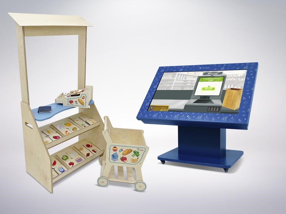 Помимо интерактивного стола в комплекте есть реквизит для традиционных игр: детский киоск АЛМА «Магазин» с кассой, тележкой и продуктами. Макеты денег и пластиковых карт, копилки, кошельки, наборы для групповых игр, что способствует усвоению навыков на практике.