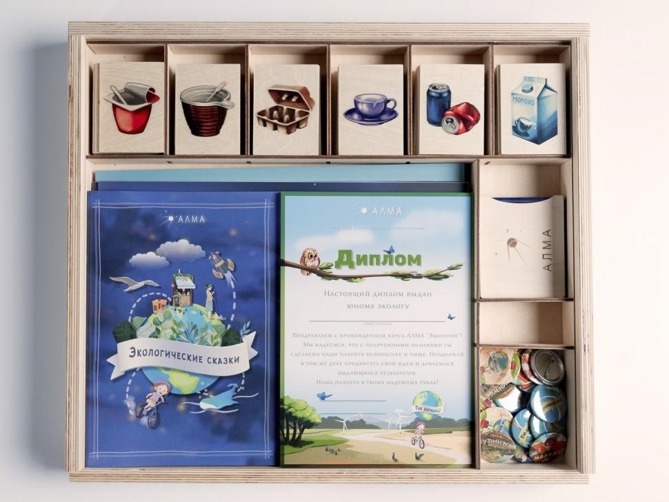 АЛМА «Экология» — это программное обеспечение, мотивационные значки АЛМА и дипломы «Юного эколога», сборник экологических авторских сказок, тематические плакаты, комплект деревянных контейнеров и игральных карточек для «сортировки мусора», карточки для проведения викторины.